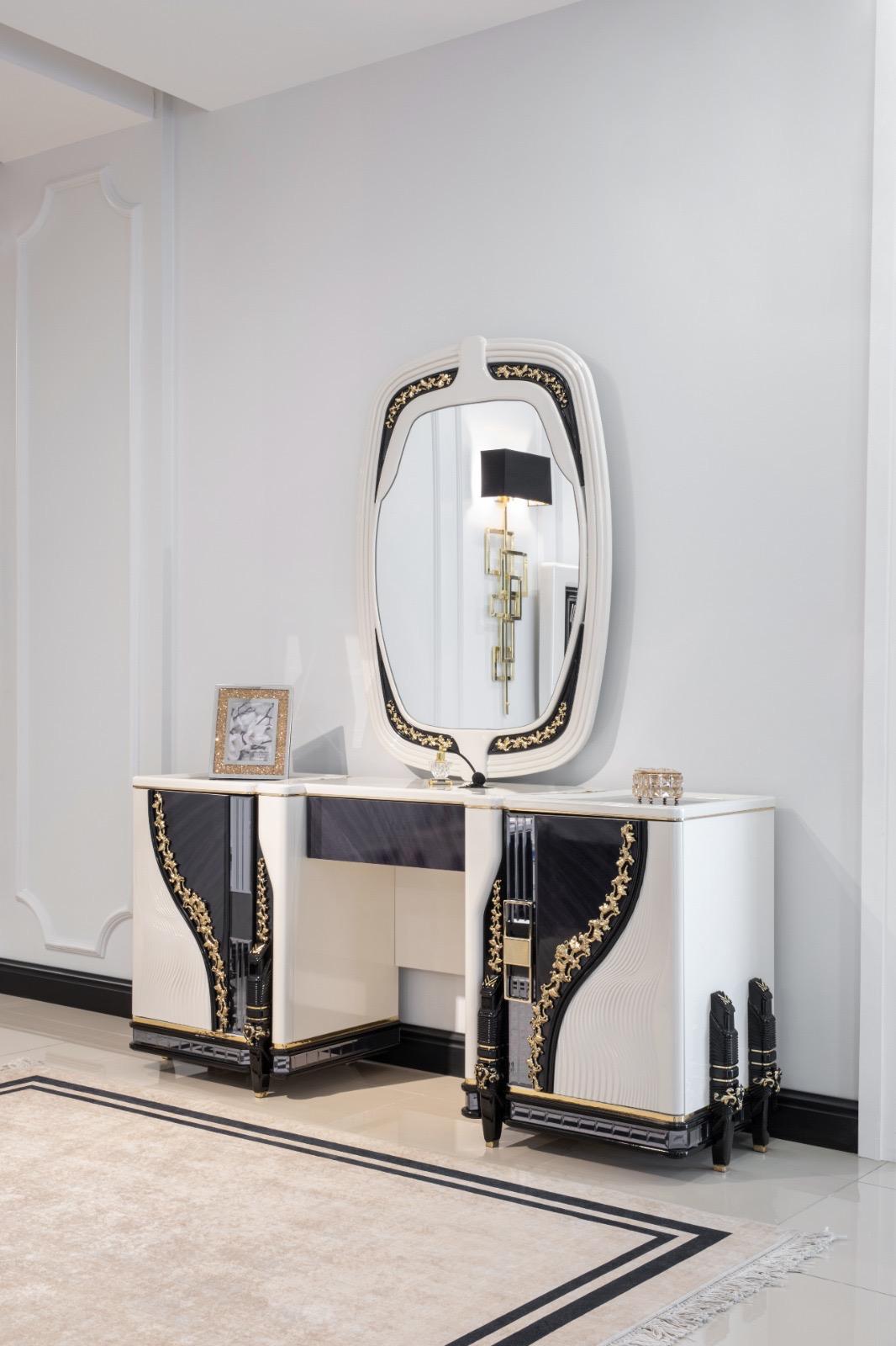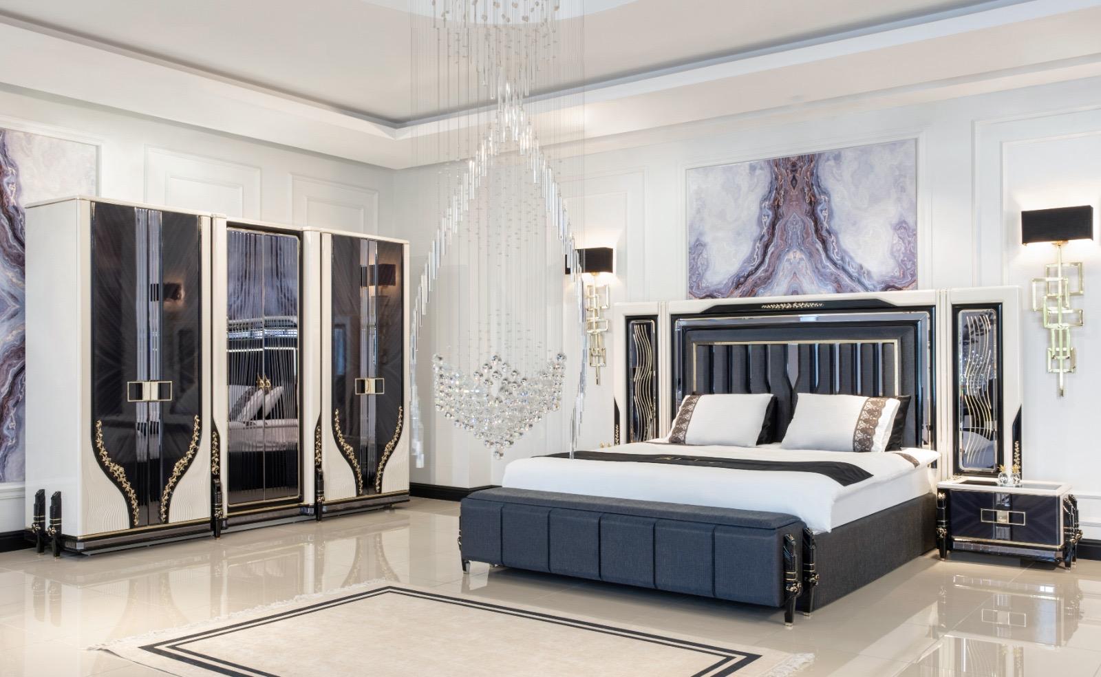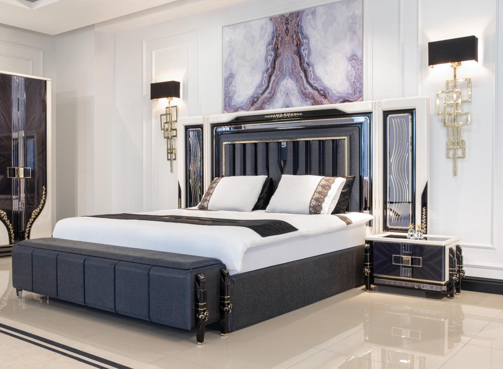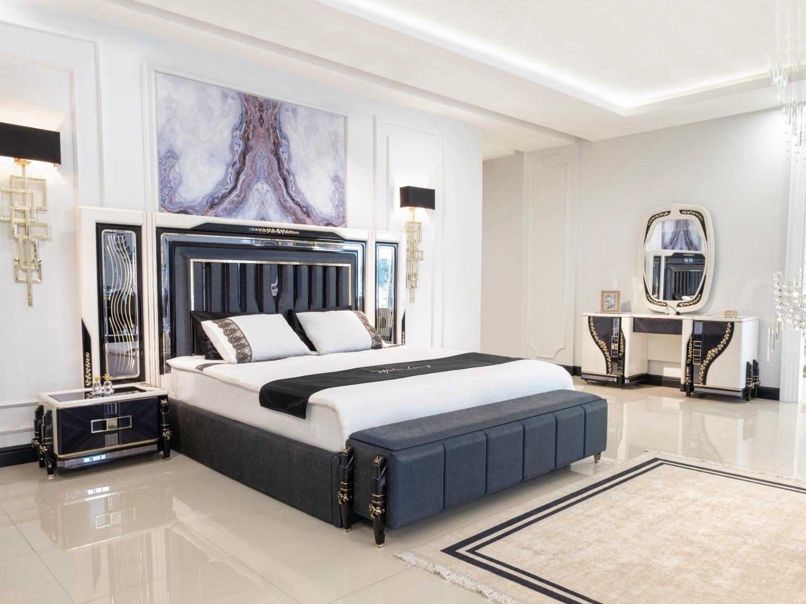 De Aventus Slaapkamer Set presenteert een gedurfde en luxueuze stijl die een statement maakt in moderne slaapkamerinrichting. De set valt op door het contrasterende gebruik van glanzende, donkere afwerkingen en opvallende, driedimensionale patronen.