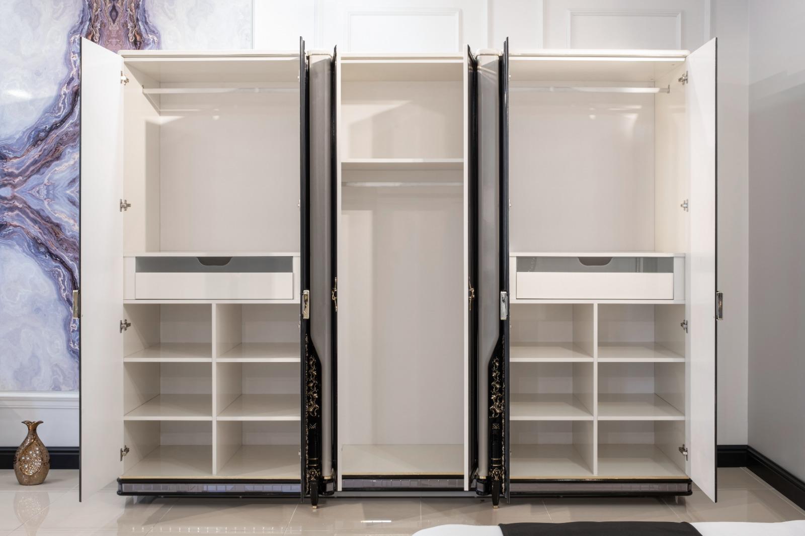 - Kast (Wardrobe): De kledingkast is strak en massief, vaak met een combinatie van de donkere houtlook en de glanzende, spiegelende panelen die de geometrische esthetiek van het hoofdbord volgen of herhalen.