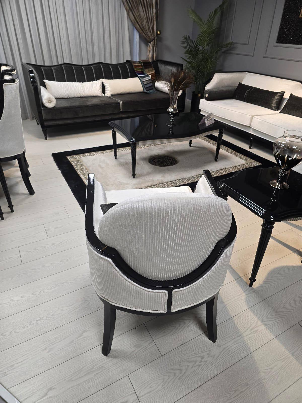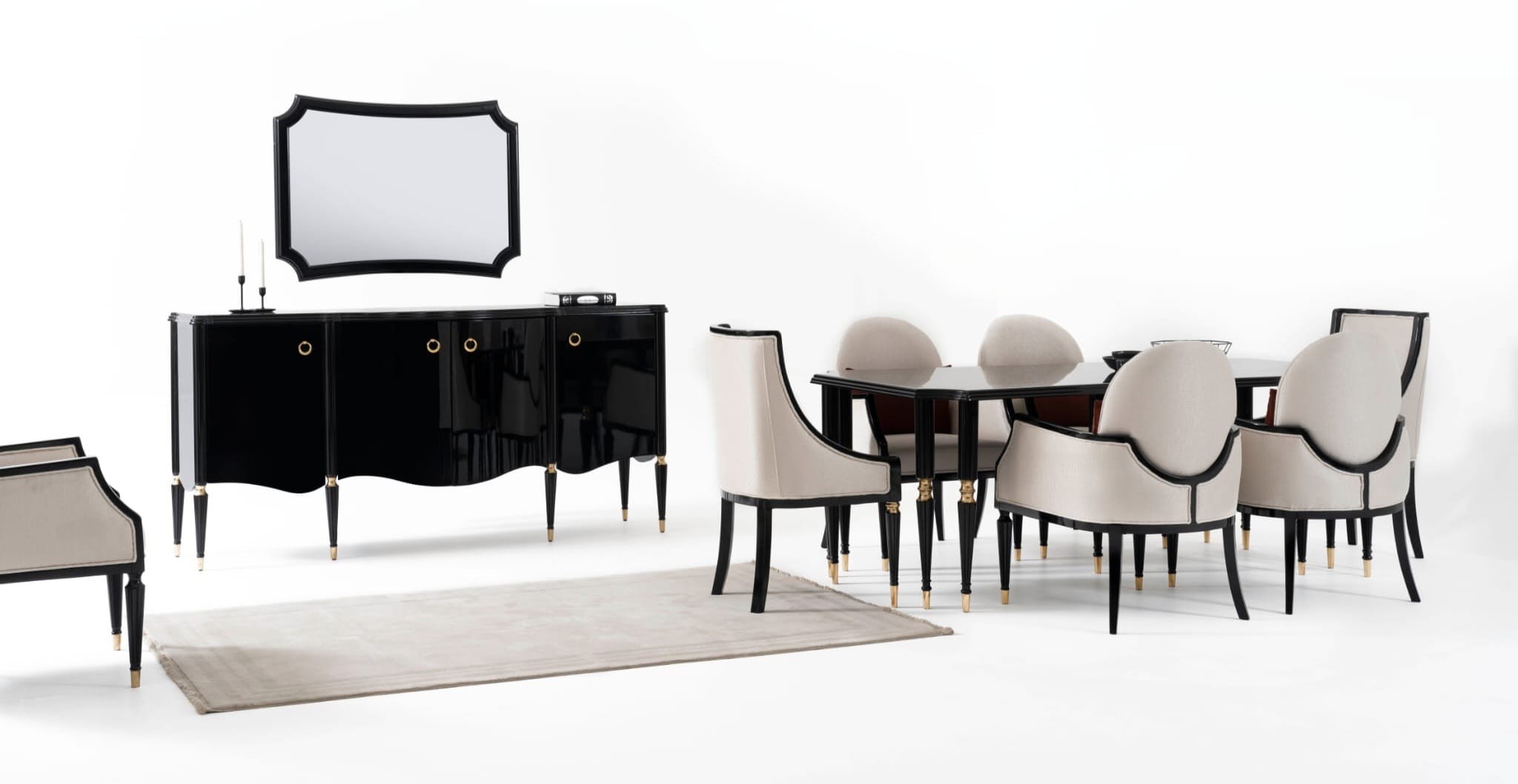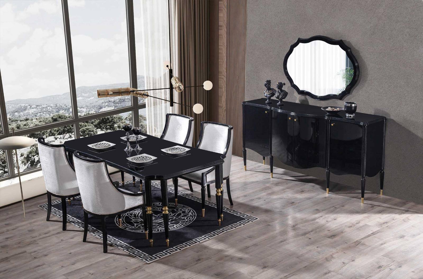 Kortom: De Classic Black Eetkamer Set is de ultieme keuze voor wie een dramatische, formele en tijdloos chique eetruimte wenst. De combinatie van glanzend zwart, zachte lichte stoffen en rijk goudaccent creëert een onvergetelijke, luxe ambiance.