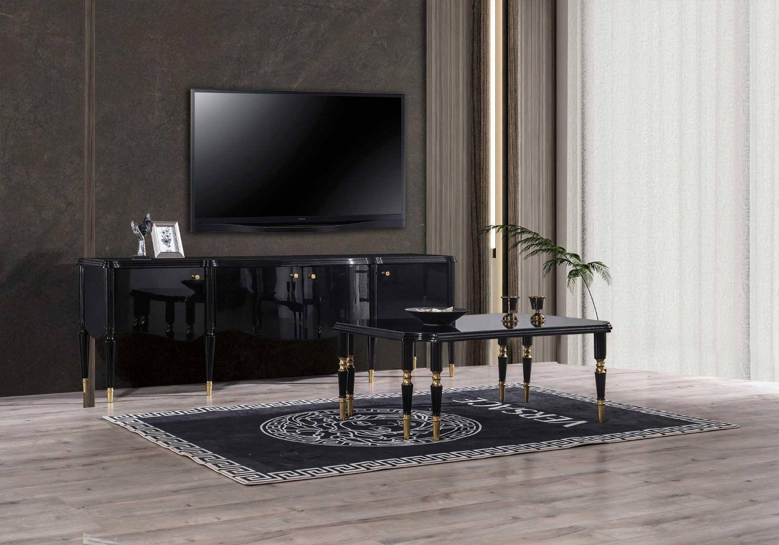 • De kasten zijn strak en rechtlijnig. Ze combineren de zwarte, glanzende afwerking met goudkleurige lijsten of frames.