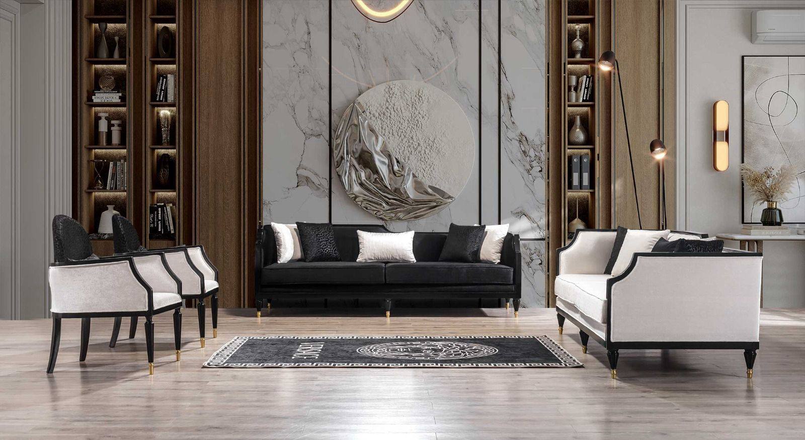 • Kleuren & Materialen: De set wordt gedomineerd door glanzend diep zwart (hoogglans) gecombineerd met glanzend goud of messingkleurige accenten. De stoelen bieden een zacht contrast in een lichte, neutrale stof.