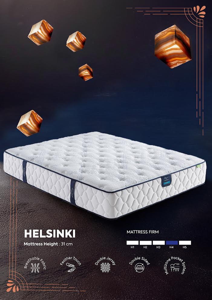 Ervaar optimaal slaapcomfort met de Helsinki matras. Dankzij het multizone pocketveringsysteem biedt de matras perfecte ondersteuning voor elke zone van het lichaam. De dubbelzijdige opbouw verlengt de levensduur, terwijl de ademende stof en double jersey afwerking zorgen voor een fris en zacht slaapgevoel. De feather touch toplaag maakt het geheel extra comfortabel.