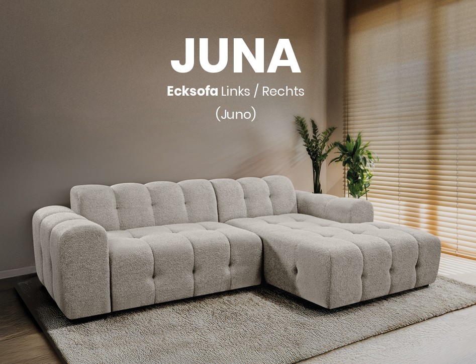 Kortom: De Juna (Juno) is de ideale bank voor liefhebbers van een zacht, uitnodigend interieur. De combinatie van de diepe zit, de brede longchair en het gewatteerde design maakt het een comfortabel middelpunt van de woonkamer.