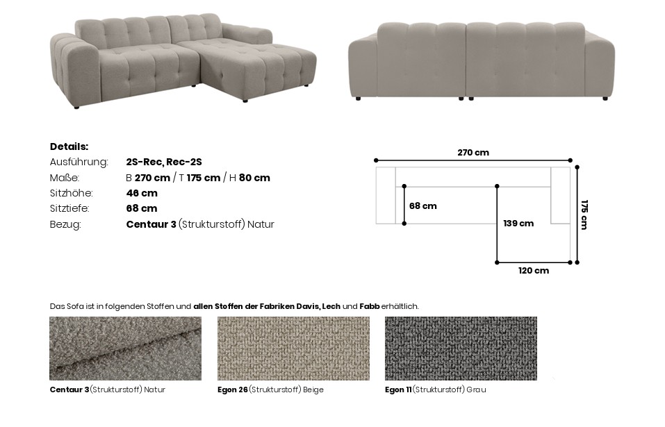 • Bekleding: Het getoonde model is uitgevoerd in een lichte structuurstof (Centaur 3), die de diepte van de stiksels mooi accentueert.