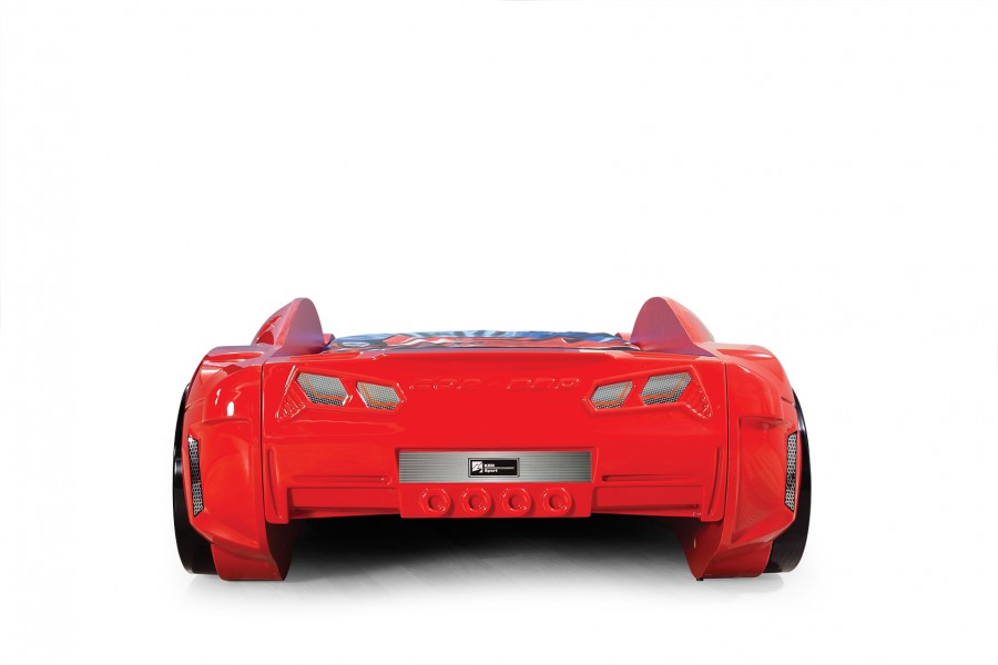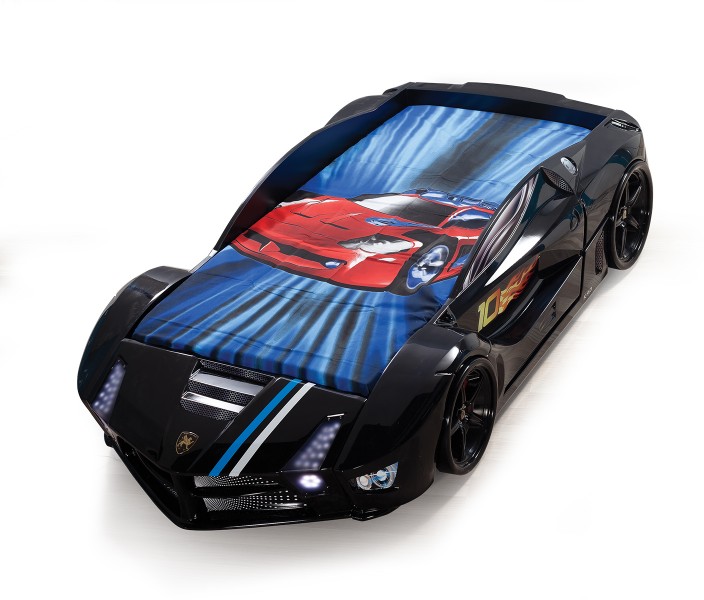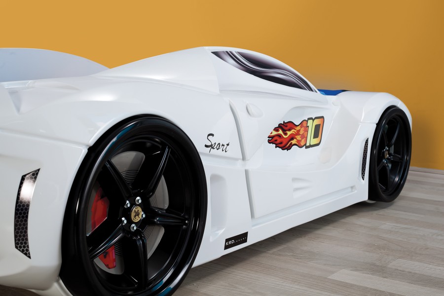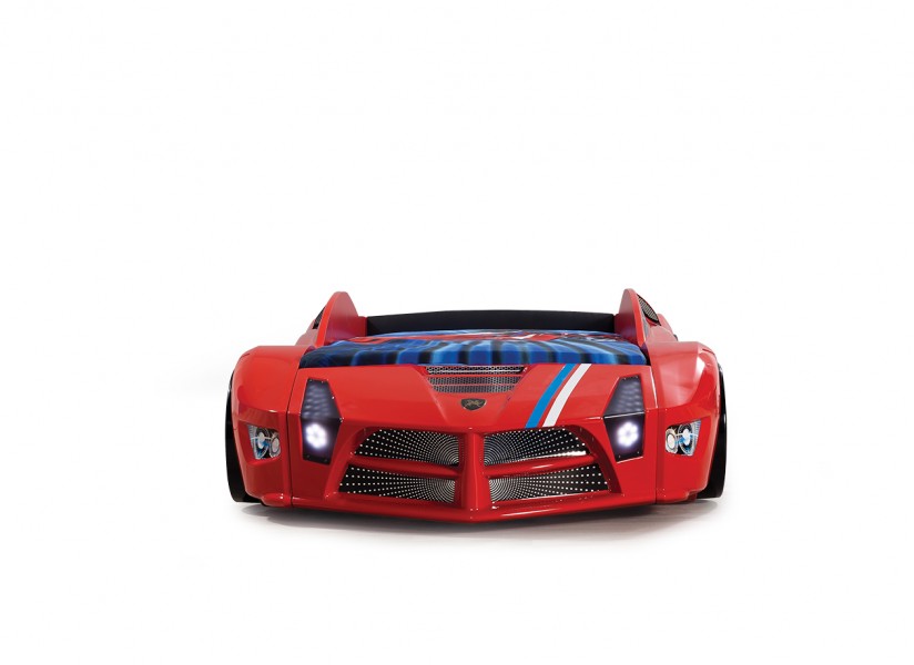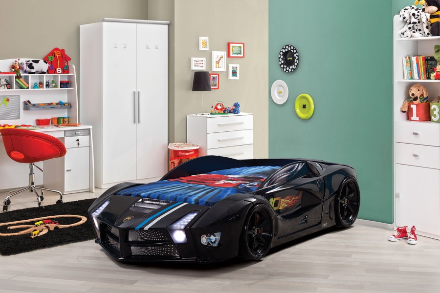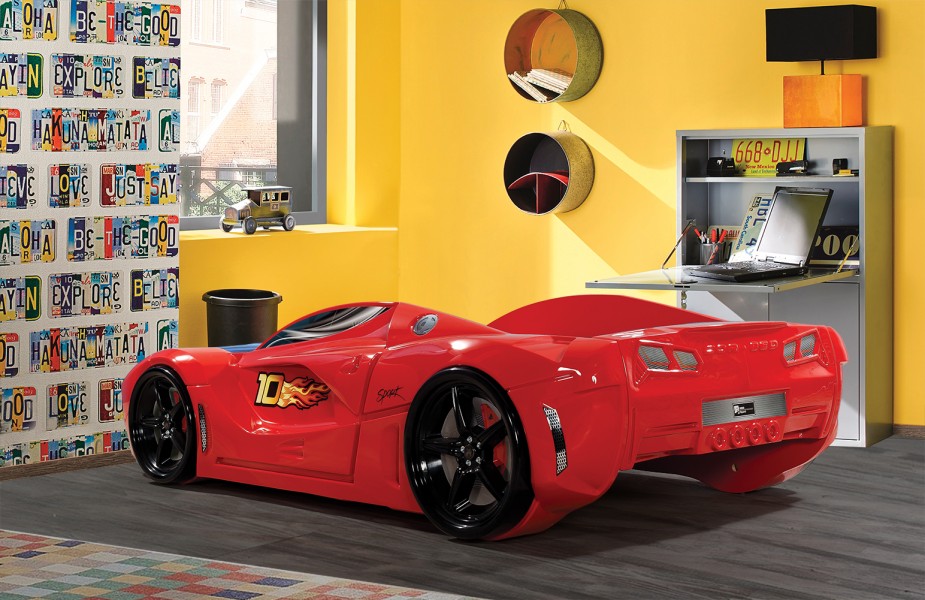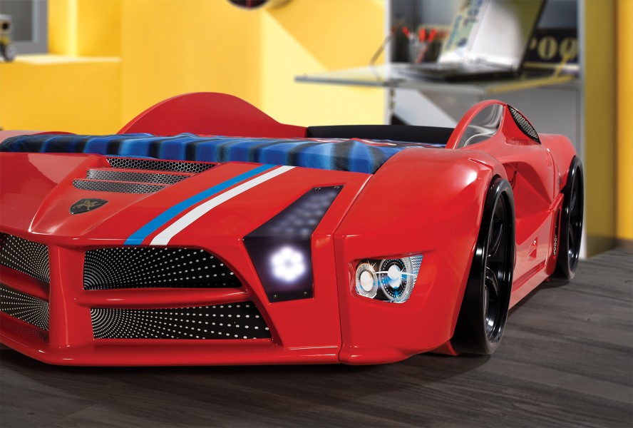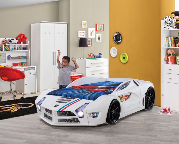 - Kernstuk: Het bed is een realistische, glanzende “Super Car” (raceauto), uitgevoerd in levendige kleuren (rood, wit of zwart).