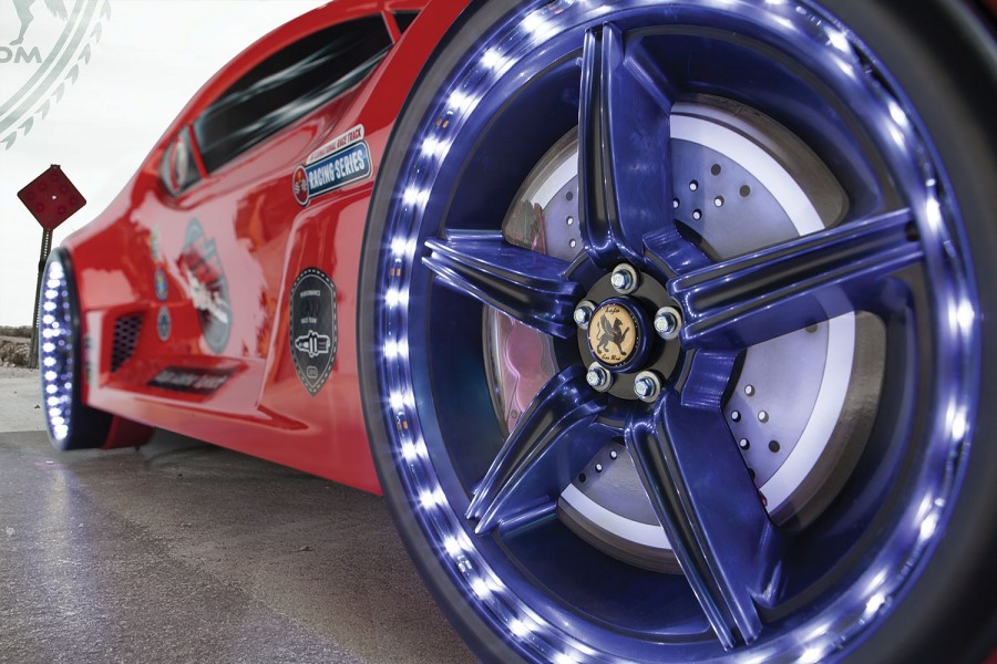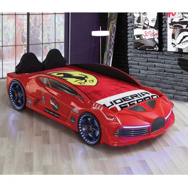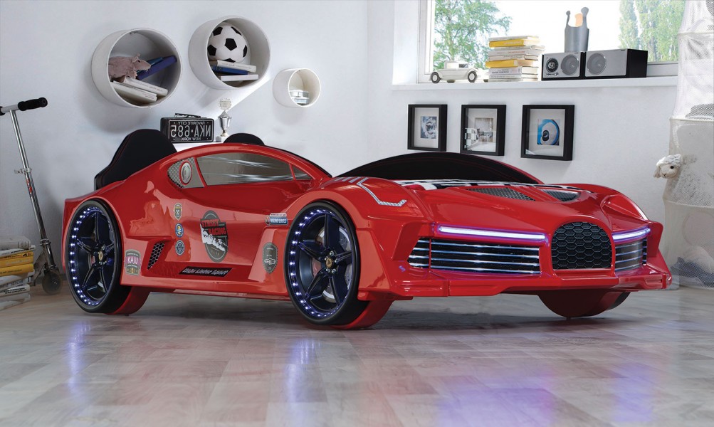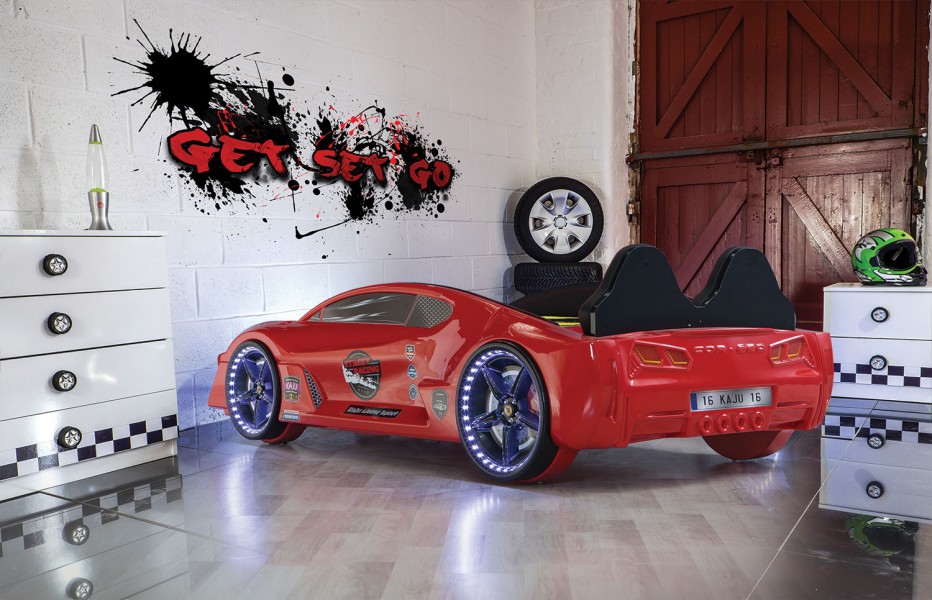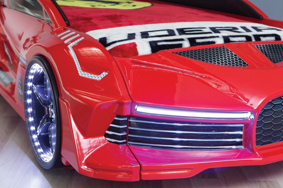 - Kernstuk: Het bed is ontworpen als een realistische, glanzende Super Car. Het design is origineel en geregistreerd.