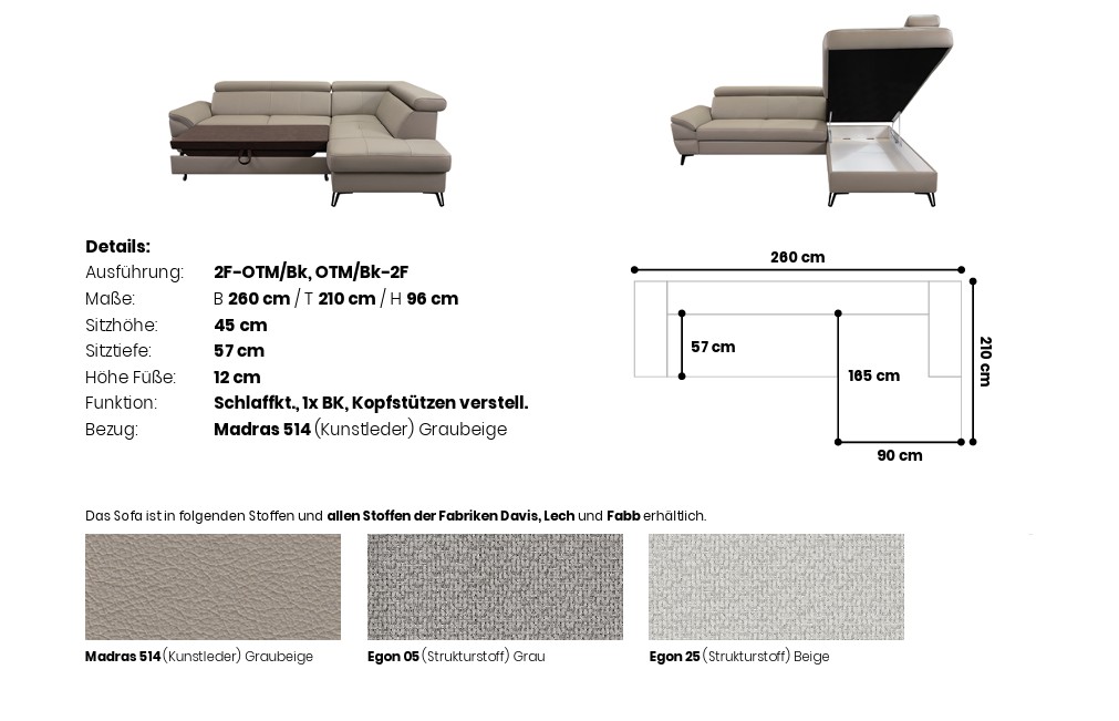 Opbergruimte: Onder het longchair-element bevindt zich een ruime opbergbak (1x BK), perfect voor het discreet opbergen van beddengoed of andere items.