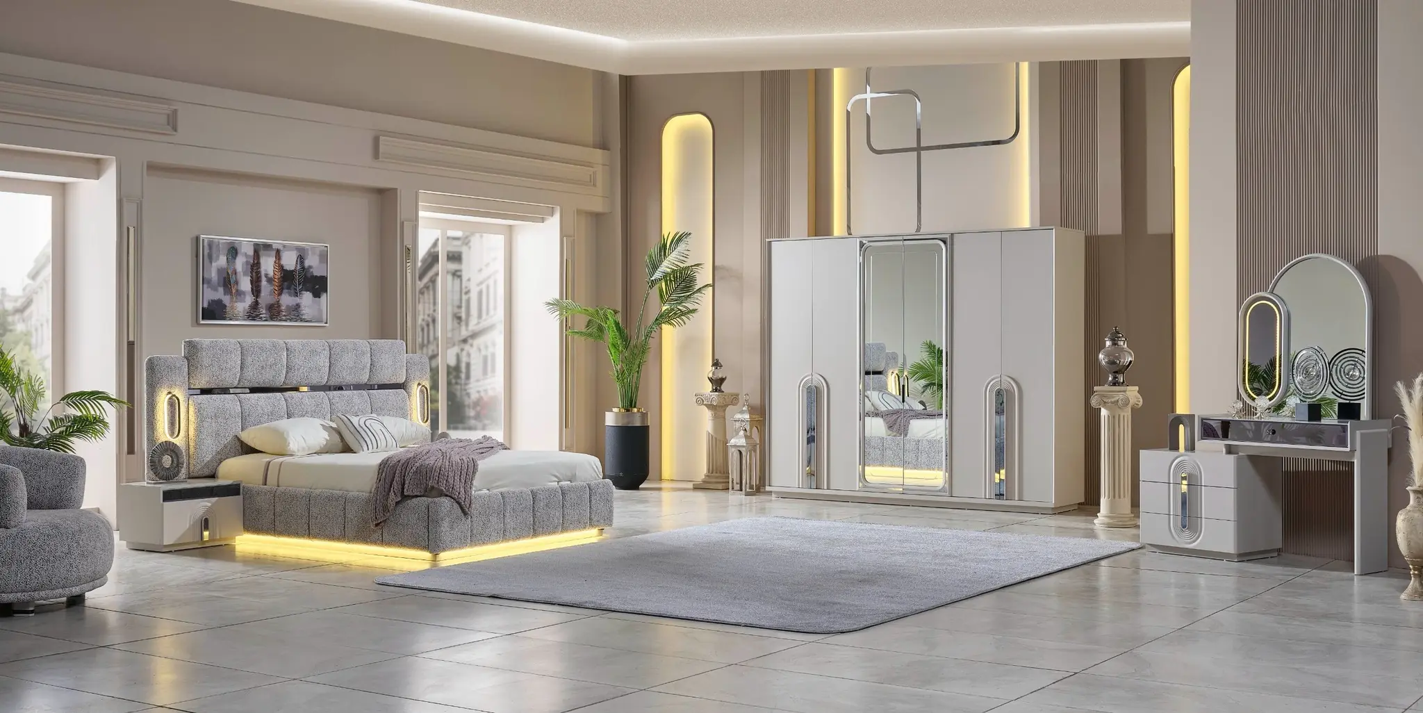 De Parma Slaapkamer Set is een luxe collectie die een tijdloos, warm notenhouten uiterlijk combineert met een strak, hedendaags design. De set creëert een rijke, aardse en zeer stijlvolle sfeer.