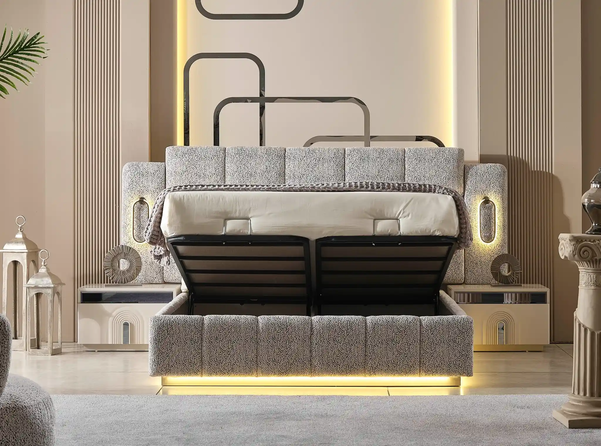 - Bedframe: Het frame is strak en laag, en biedt een stevige basis.