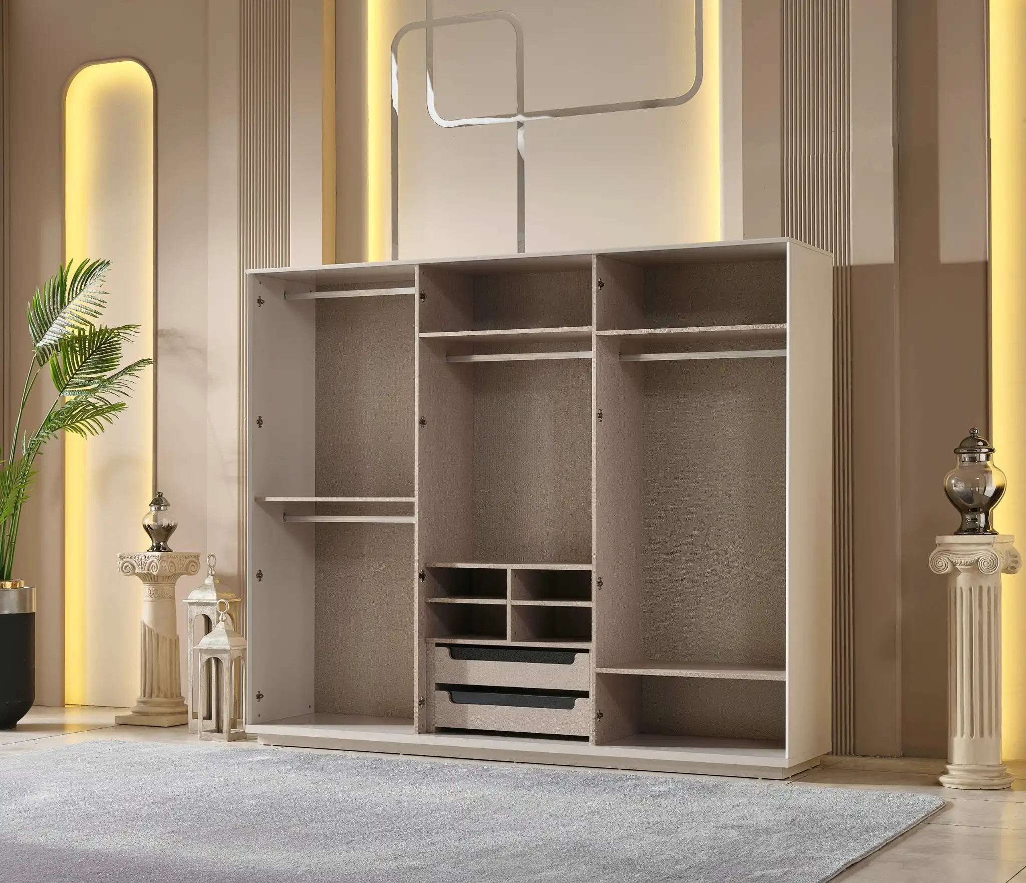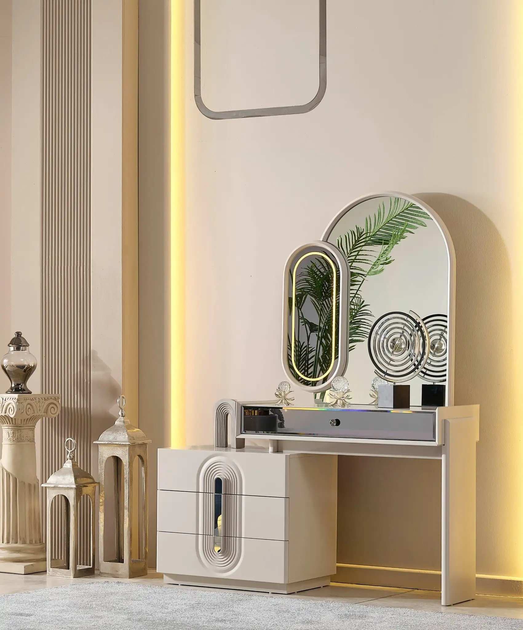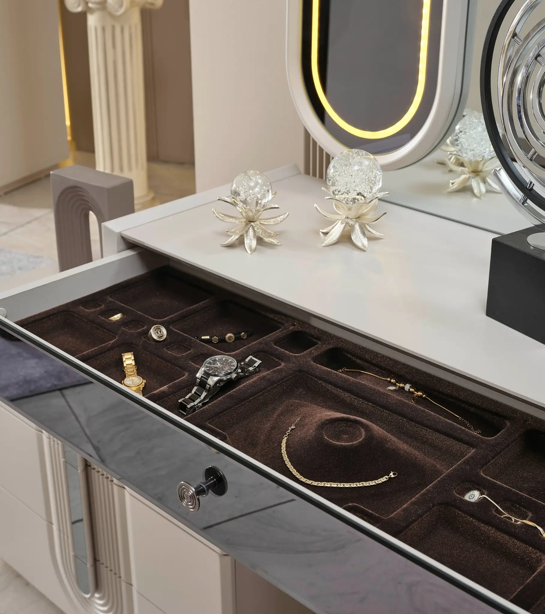 - Een bijpassende dressoir of kaptafel met royale opberglades. De meubelvlakken zijn strak en laten de warme houtnerf goed tot zijn recht komen, vaak onderbroken door de lichte, matte panelen.