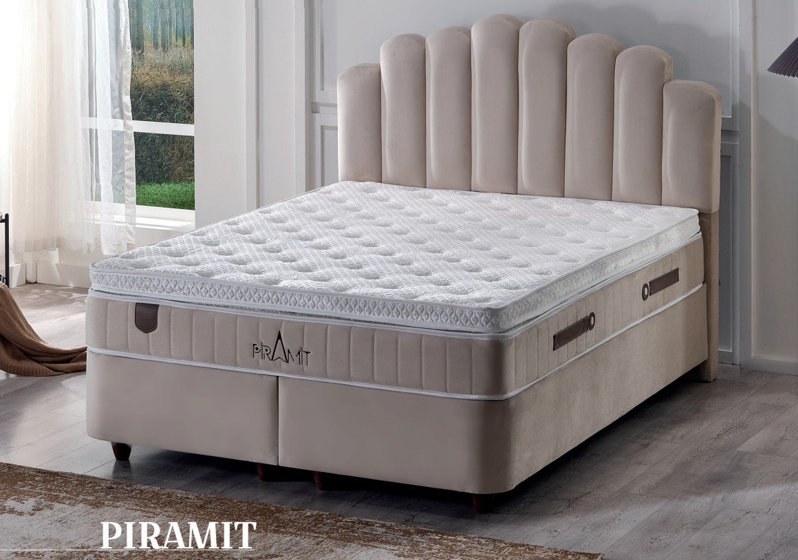 De Piramit Boxspring draagt je boven de wolken dankzij de zacht getextureerde pluche stof van het matras. De hoge DNS-pad spons zorgt voor maximaal comfort en een heerlijk zacht liggevoel. Dit bed is ontworpen om een uiterst comfortabele en luxueuze slaapomgeving te creëren.
