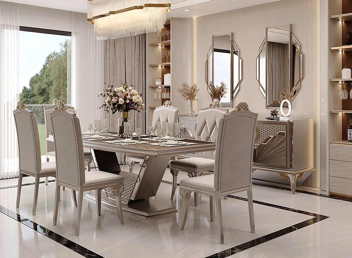 De Saray Eetkamer Set is een high-end, moderne collectie die een formele en indrukwekkende eetomgeving creëert. De set valt op door het gebruik van een donkere, glanzende afwerking en opvallende, glanzende goudaccenten.