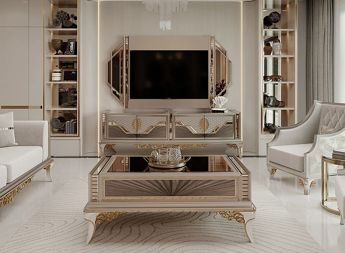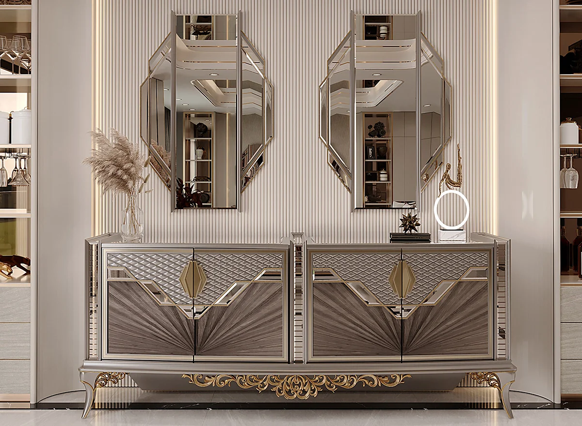 • Het meest kenmerkende element is het gebruik van goudkleurige, geometrische inleg of kaders op de fronten van de deuren en lades. Dit creëert een luxe, Art Deco-geïnspireerd patroon.