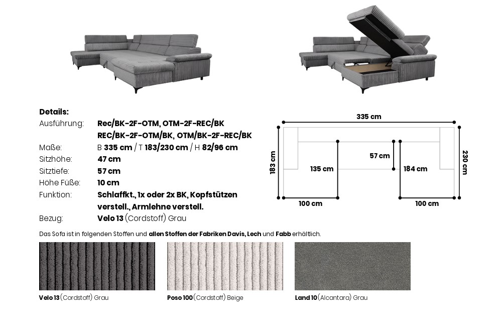 Opbergruimte: Afhankelijk van de configuratie is de bank leverbaar met één of twee geïntegreerde opbergbakken (BK) onder de longchairs. Deze ruime opbergmogelijkheden zijn perfect voor het opbergen van beddengoed of kussens.
