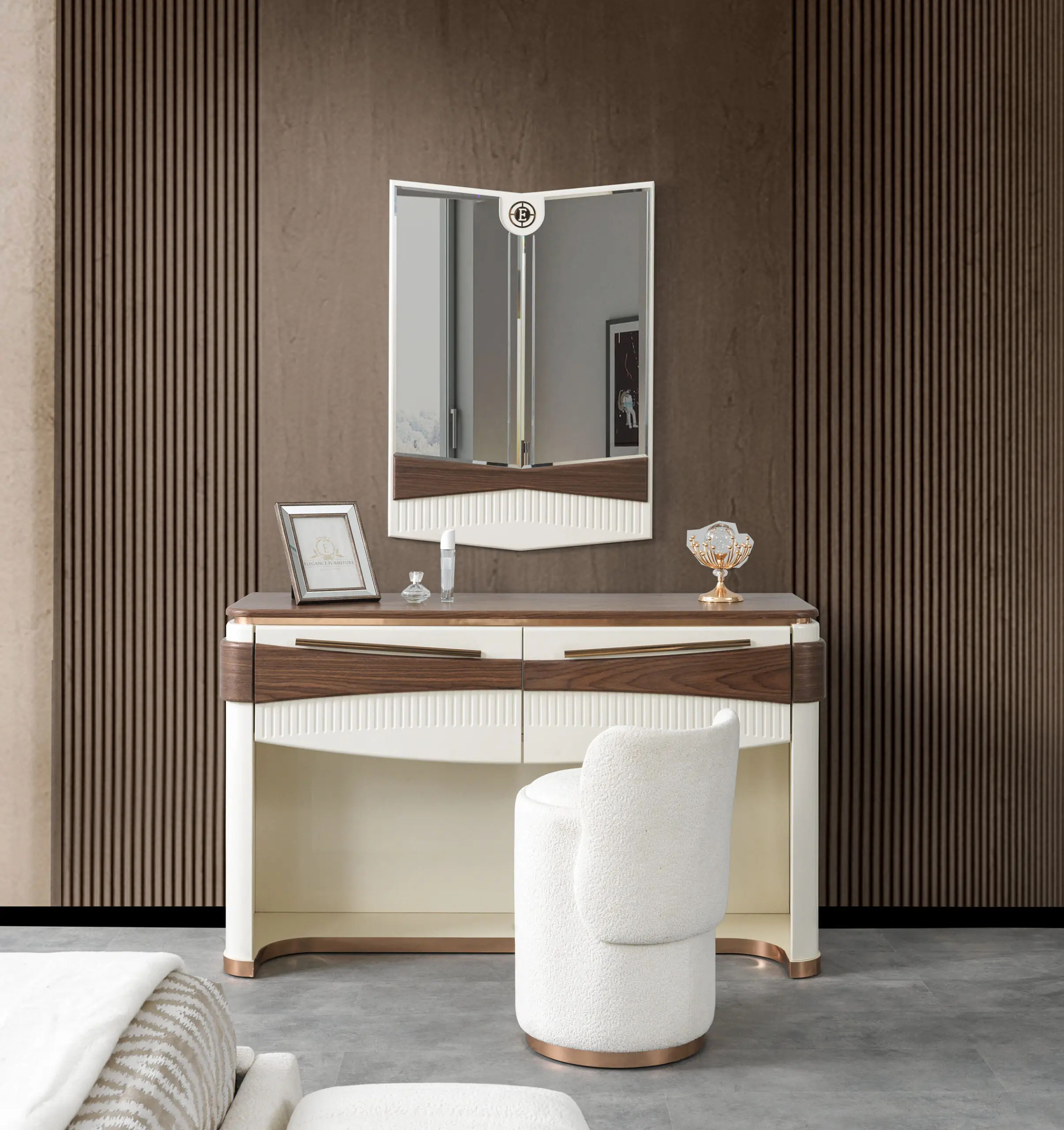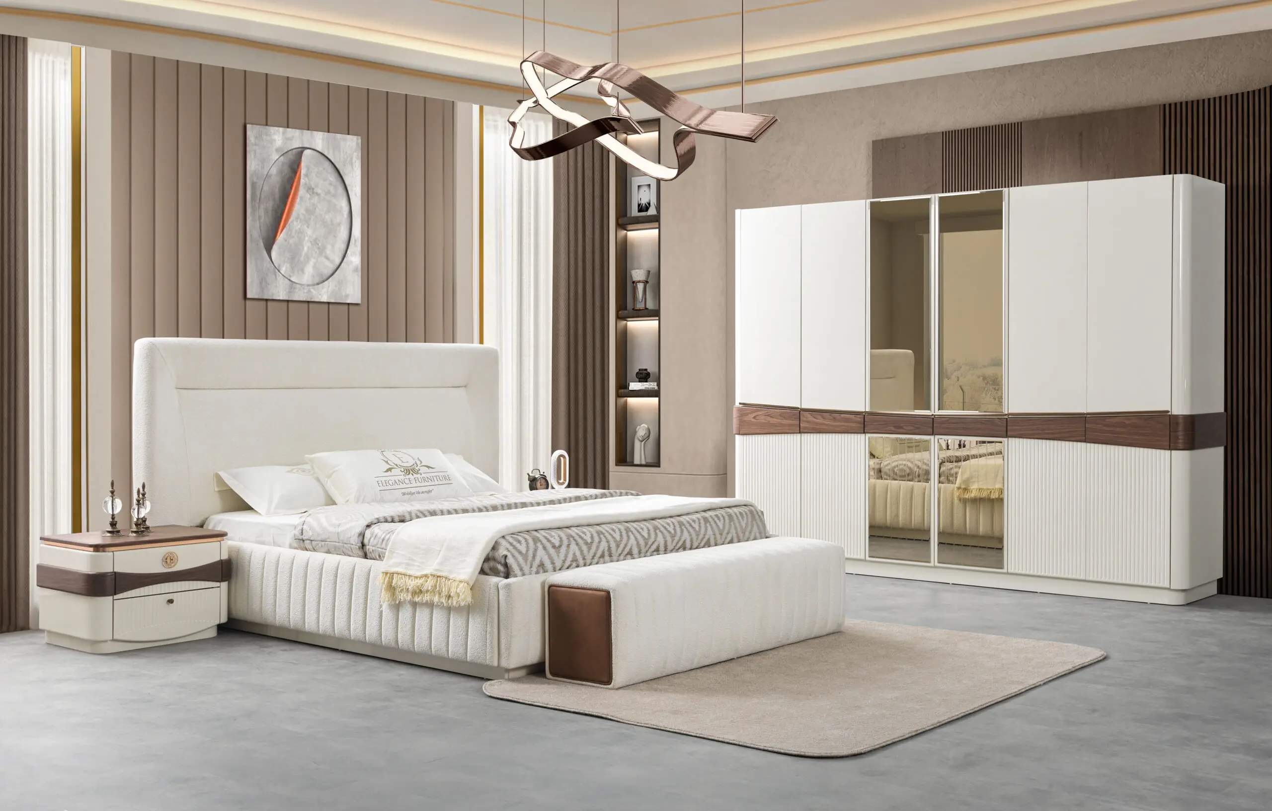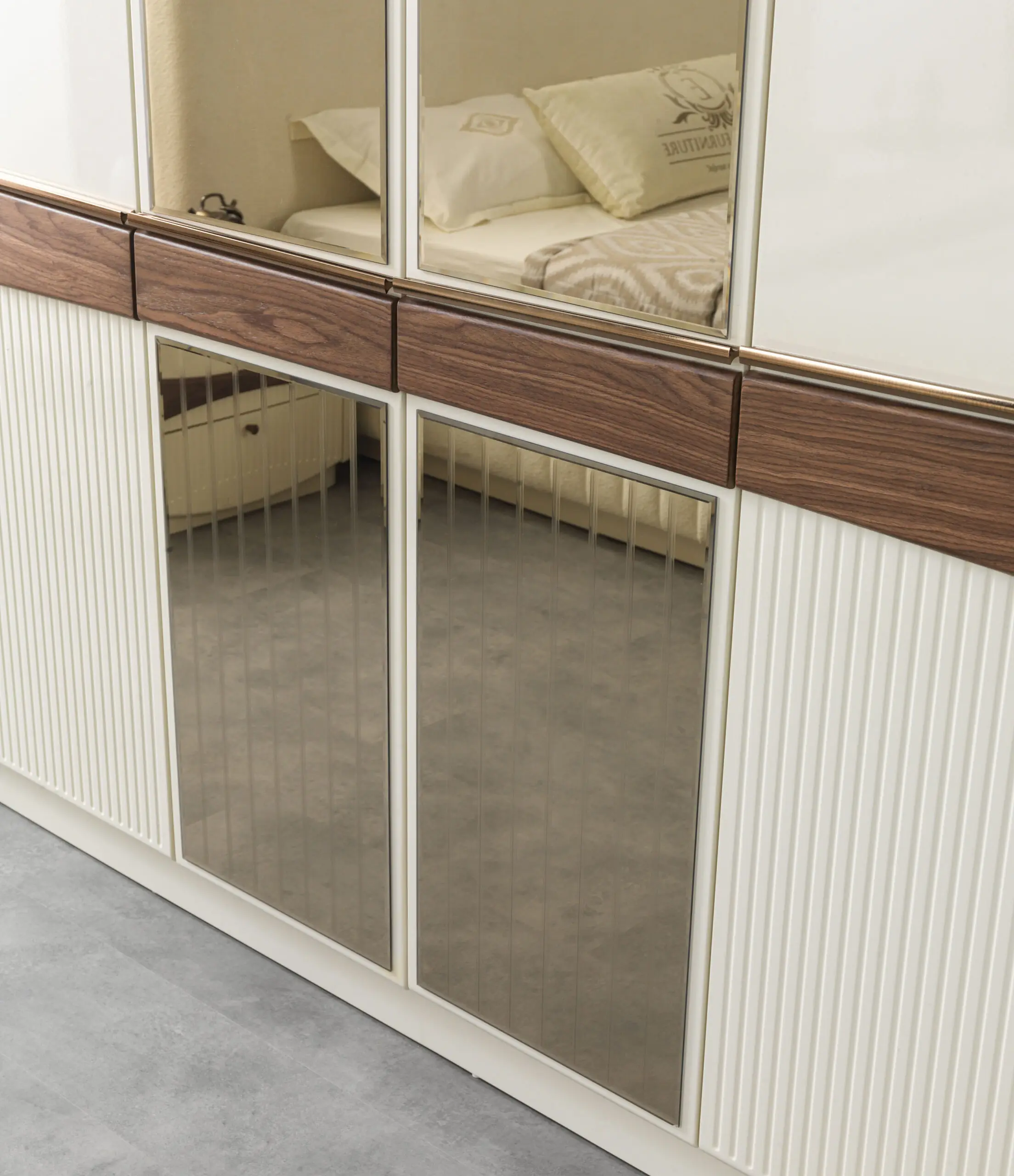 • Kast (Wardrobe): De kledingkast is groot en robuust. De deuren zijn uitgevoerd in de houtlook en kunnen een gedefinieerd houten paneelpatroon hebben. Soms zijn er centrale spiegelpanelen aanwezig, ingelijst door het donkere hout.