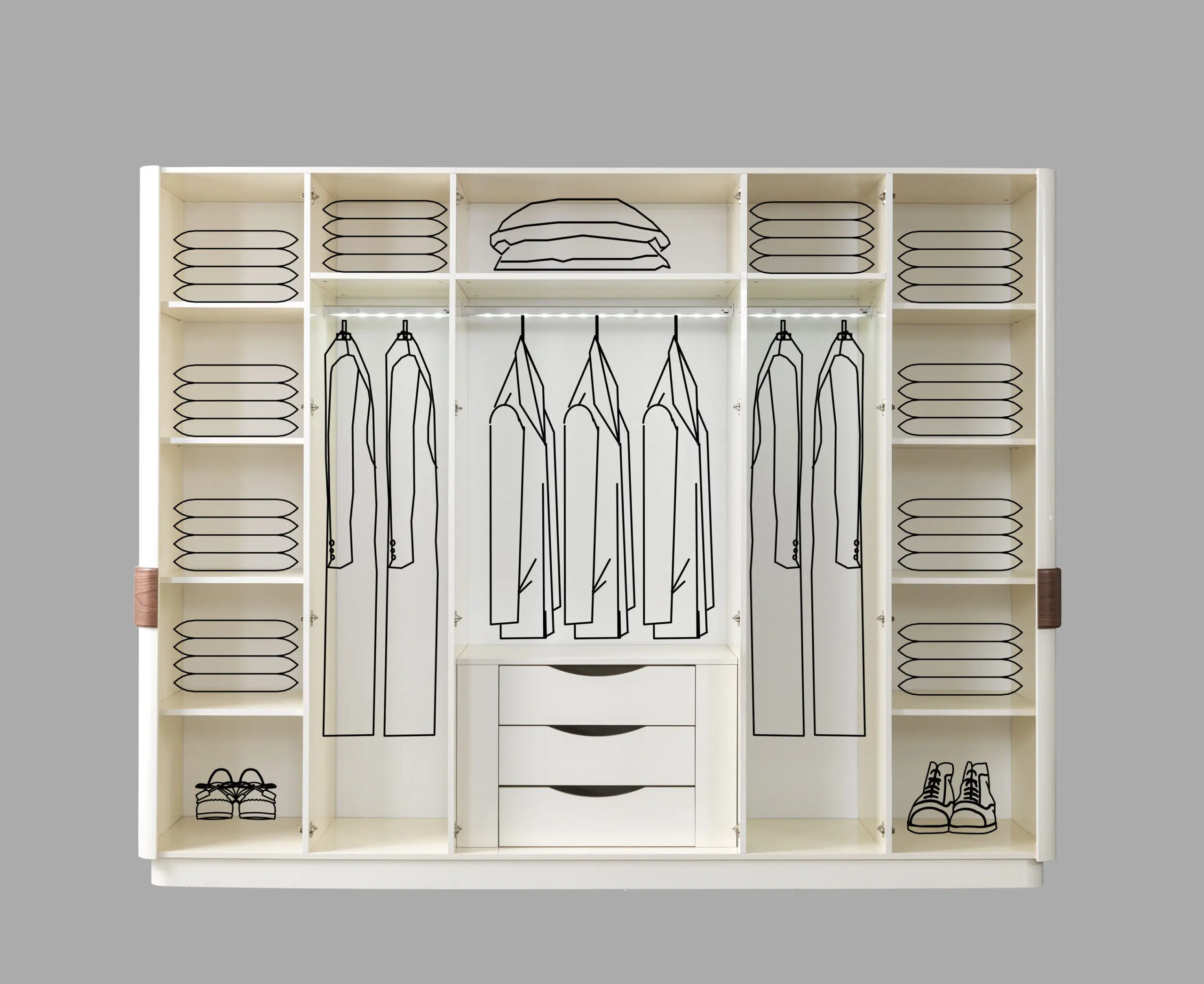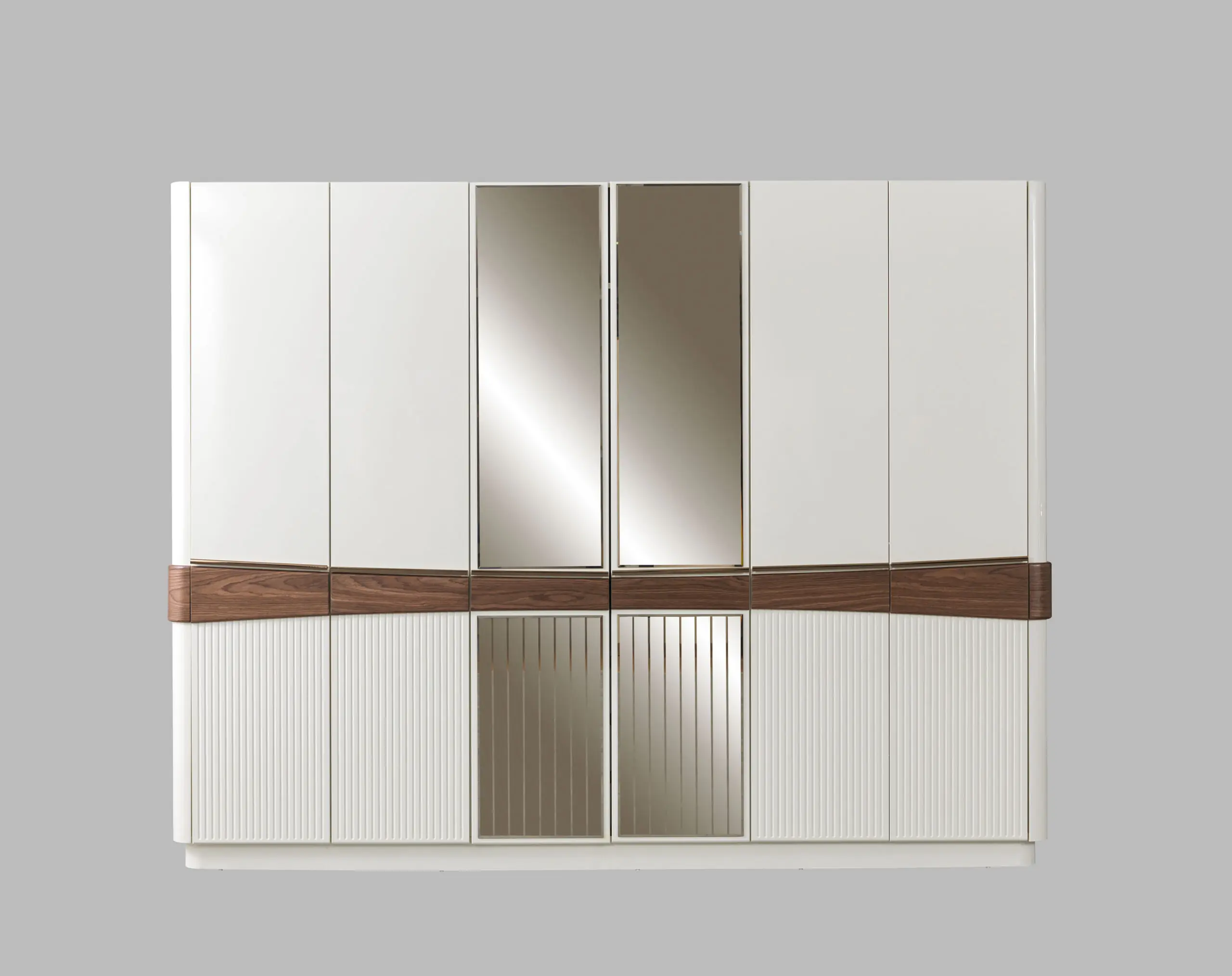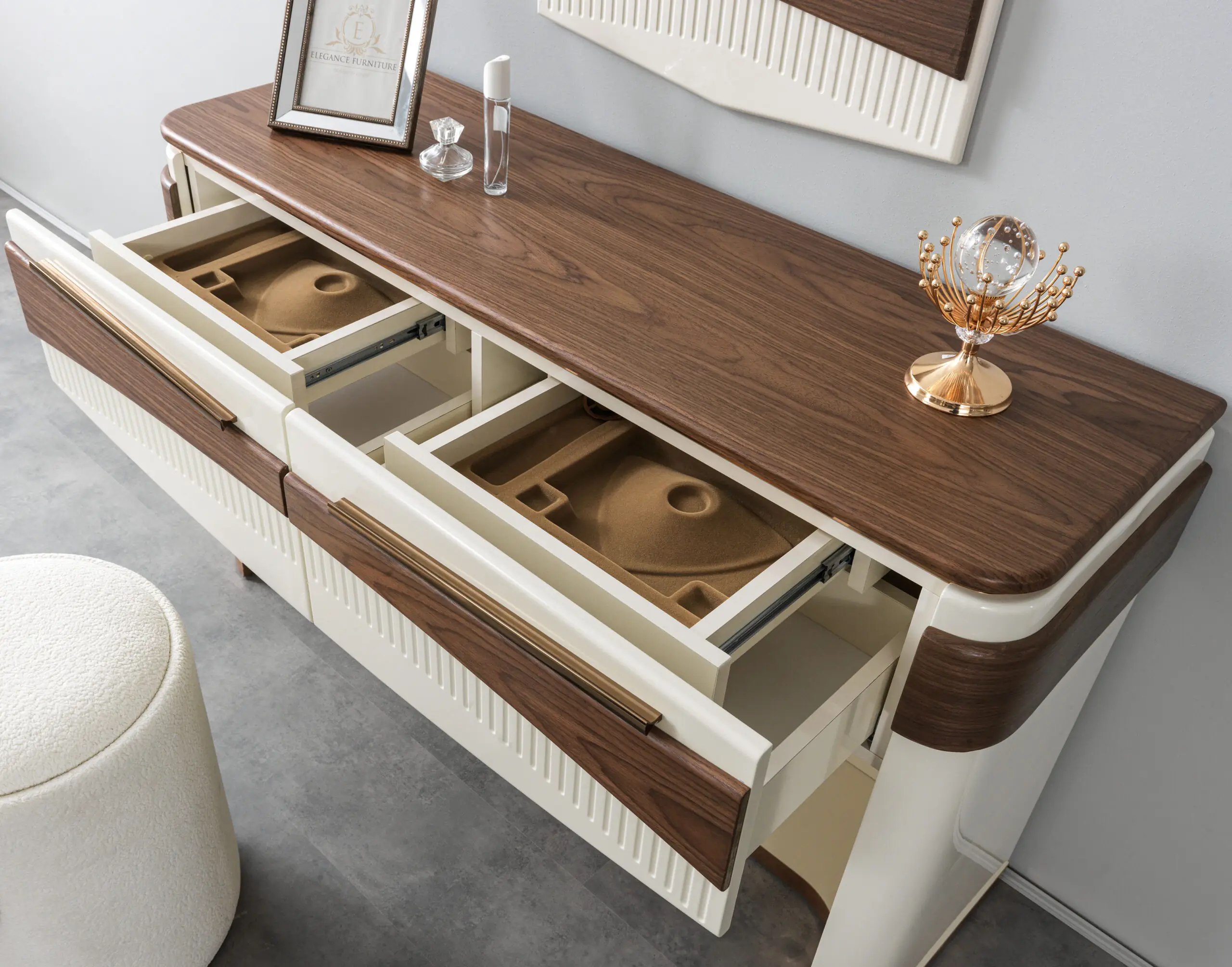 • Kast (Wardrobe): De kledingkast is groot en robuust. De deuren zijn uitgevoerd in de houtlook en kunnen een gedefinieerd houten paneelpatroon hebben. Soms zijn er centrale spiegelpanelen aanwezig, ingelijst door het donkere hout.
