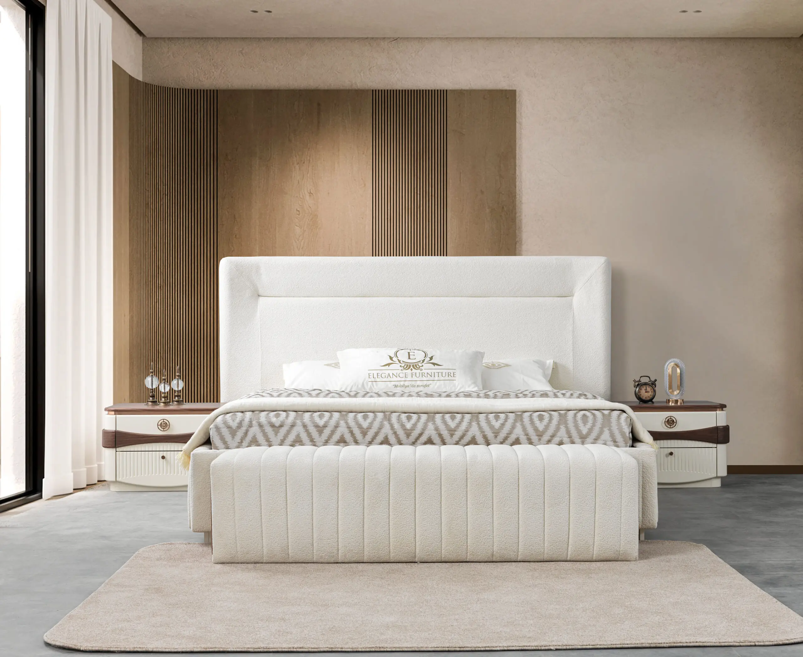 • Bed: Het bed heeft een strak, massief ogend frame. Het meest opvallende is het hoofdbord, dat vaak in de warme houtlook is uitgevoerd en voorzien is van horizontale of verticale groeven/panelen, wat een gestructureerd, modern detail toevoegt.
