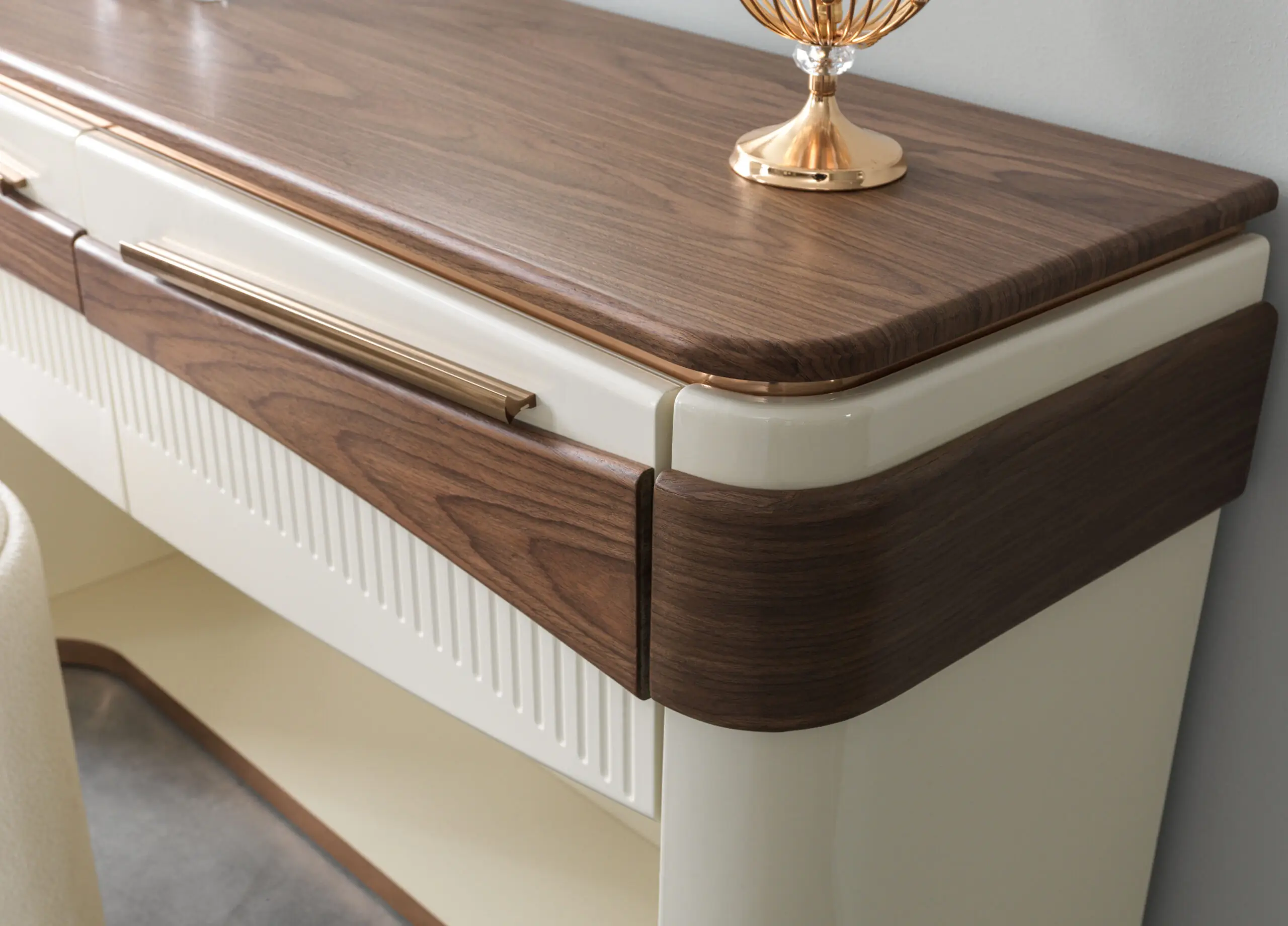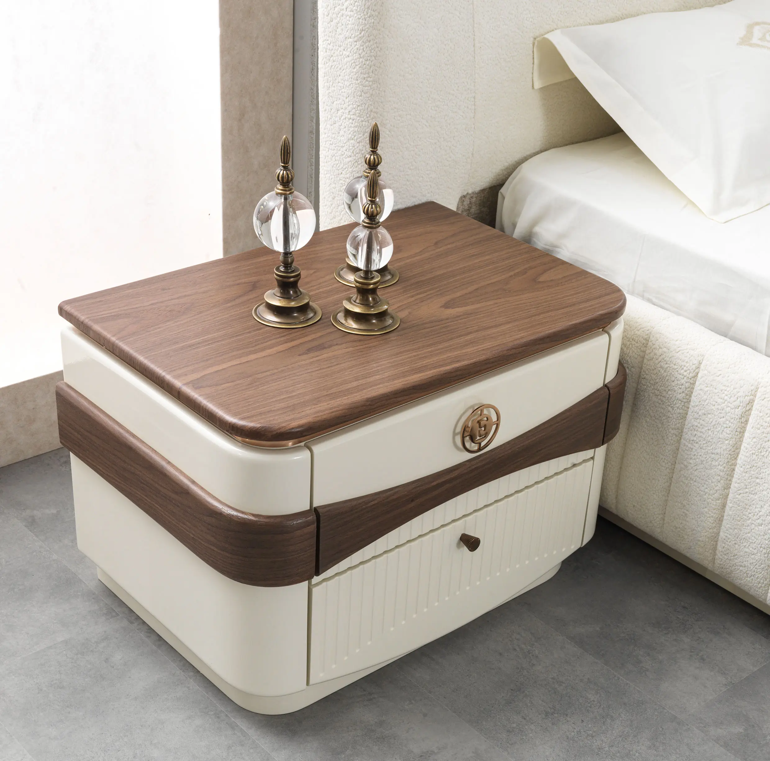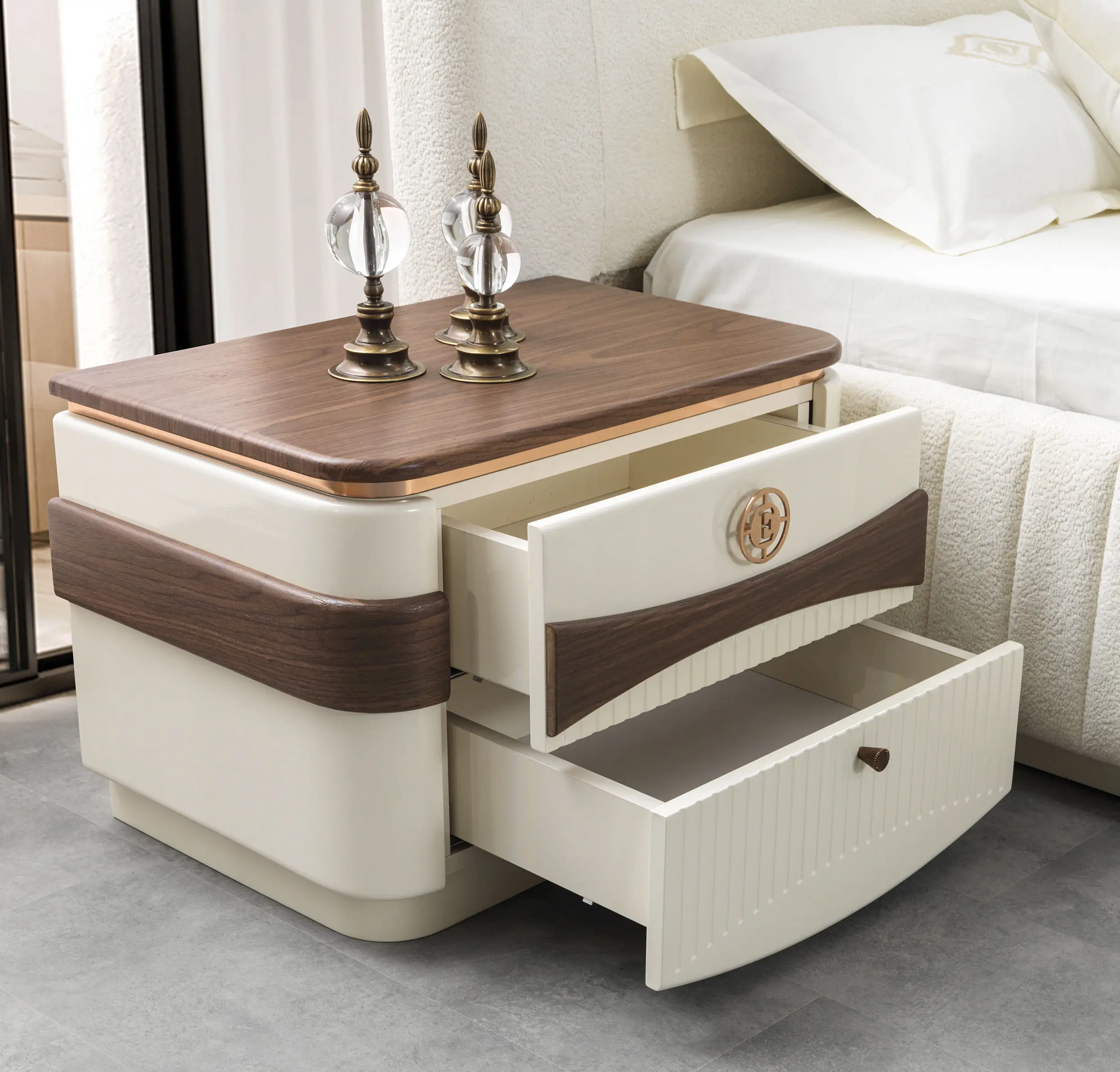• Nachtkastjes & Commode: Deze elementen zijn strak en kubusvormig, volledig uitgevoerd in de donkere houtlook. Een kenmerkend detail is het gebruik van ingefreesde handgrepen of zeer minimalistische, donkere metalen grepen, waardoor de strakke lijnen van het hout behouden blijven.