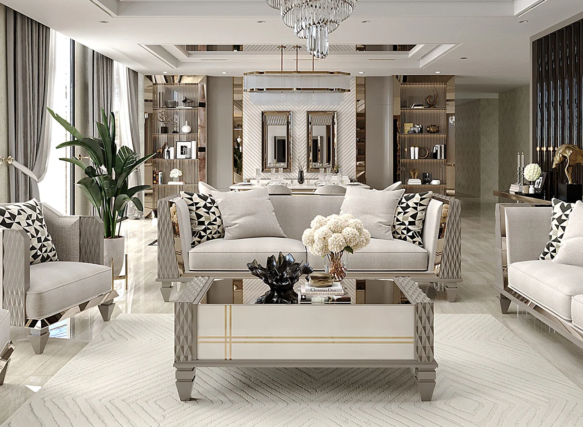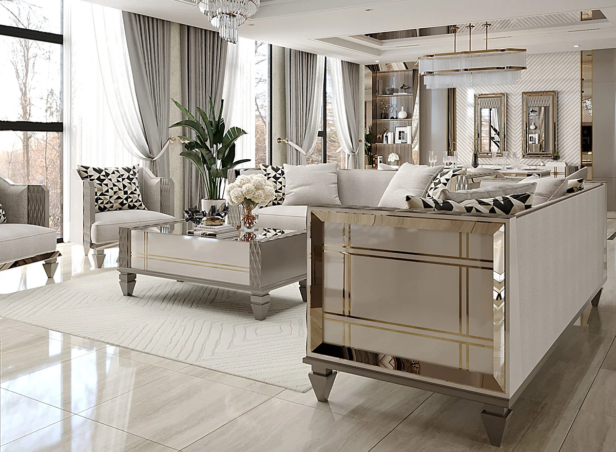 - Details: De set staat op slanke, lage poten (mogelijk in een goud- of messingkleur) die de banken een lichte uitstraling geven, wat perfect past bij het serene kleurenpalet. Decoratieve kussens zorgen voor textuur en subtiele kleurnuances.